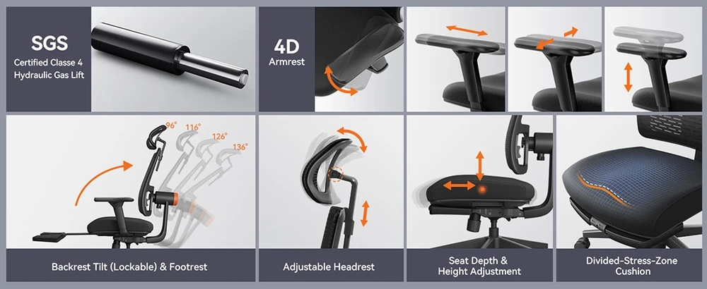 Tutti questi elementi lavorano insieme per offrire una postura perfettamente bilanciata e una sensazione di comfort anche dopo molte ore di utilizzo continuo.